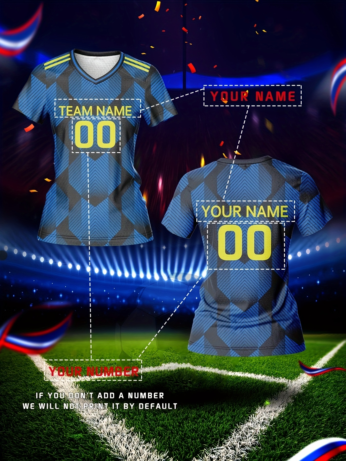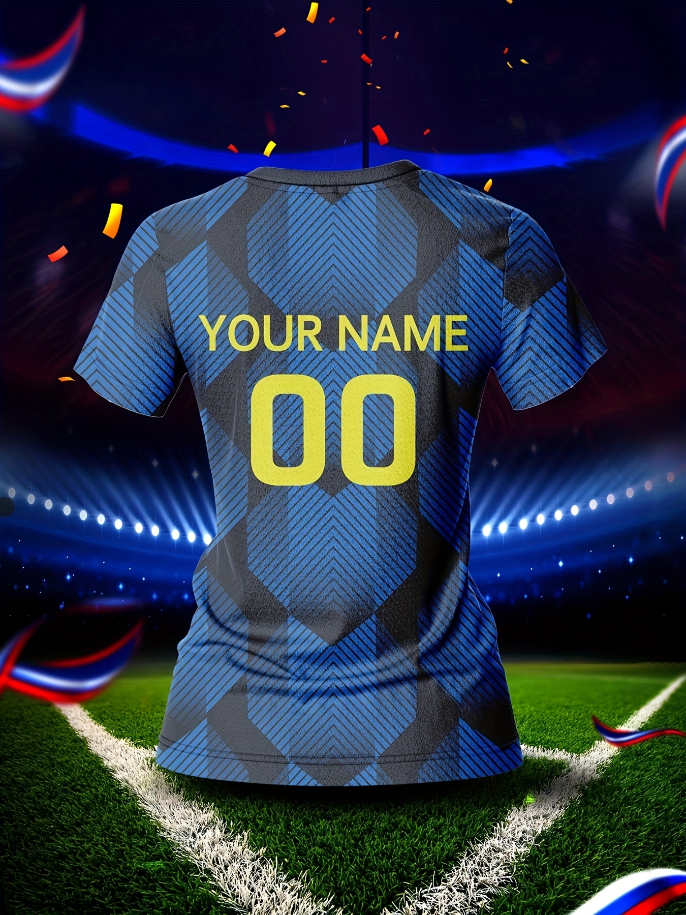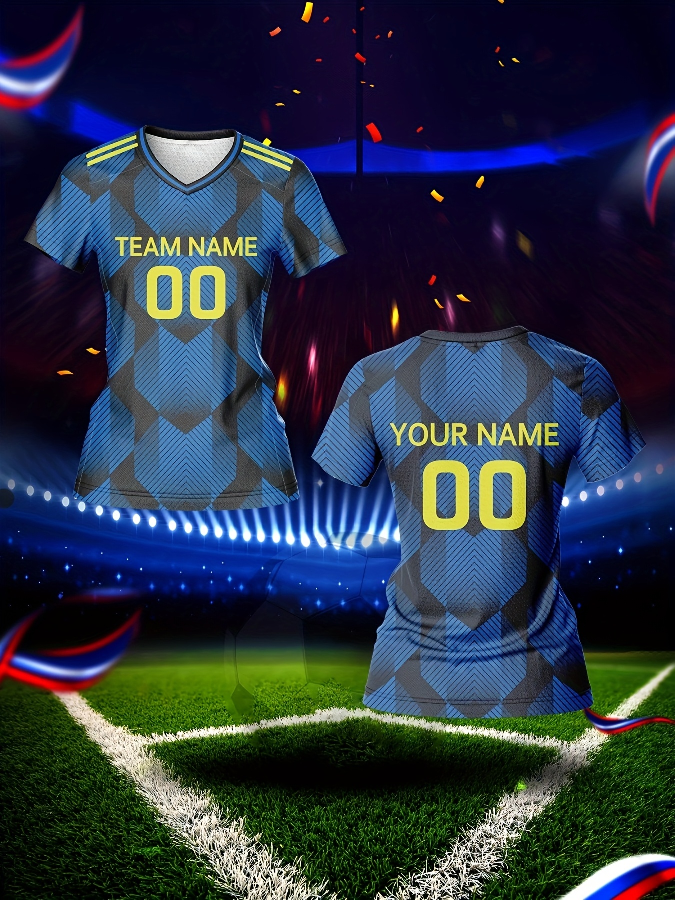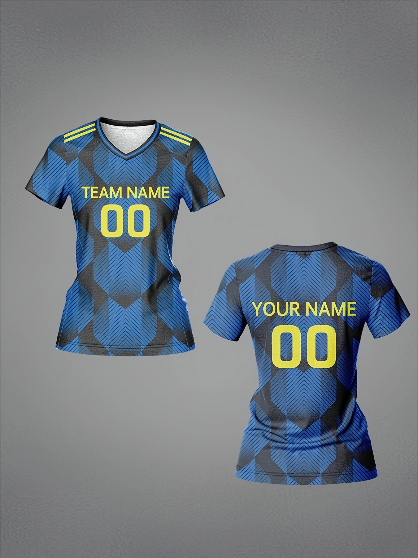 Custom Name & Number Women's V-Neck Football Jersey - Blue & Black Checkered Design, Breathable & Quick-Dry Polyester Sports Top for Team Training, Fitness & Casual Wear