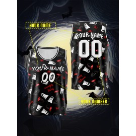 Customized Name And Number Boy's Basketball Sports Vest, Halloween Theme Ghost And Bat Pattern Print Breathable Vest For Game Team Training Outdoor Sports Running Workout