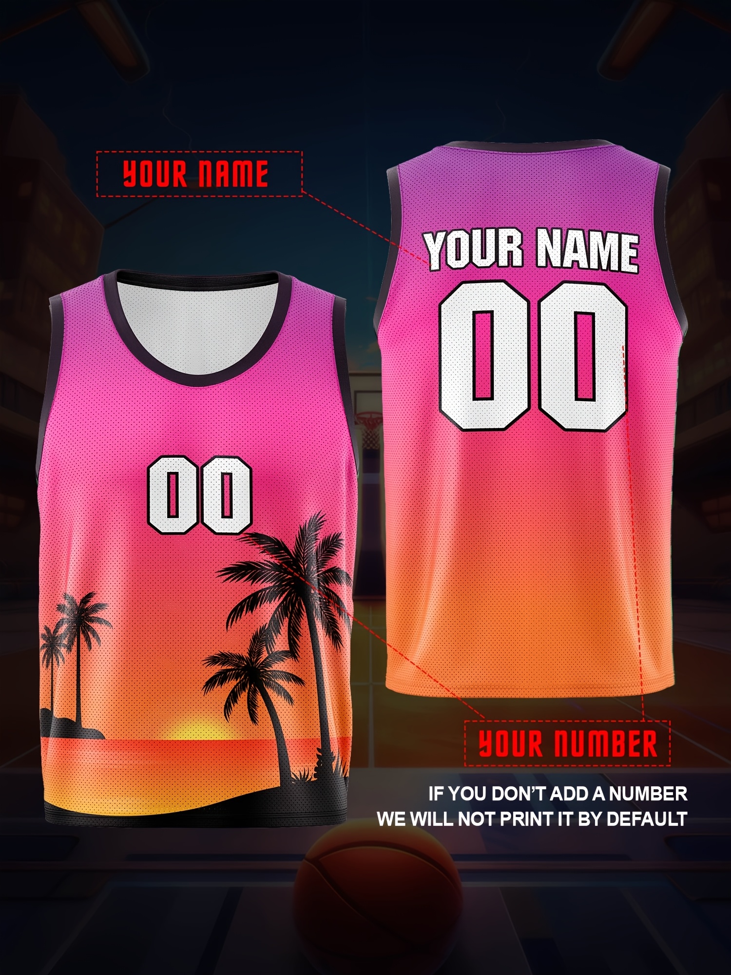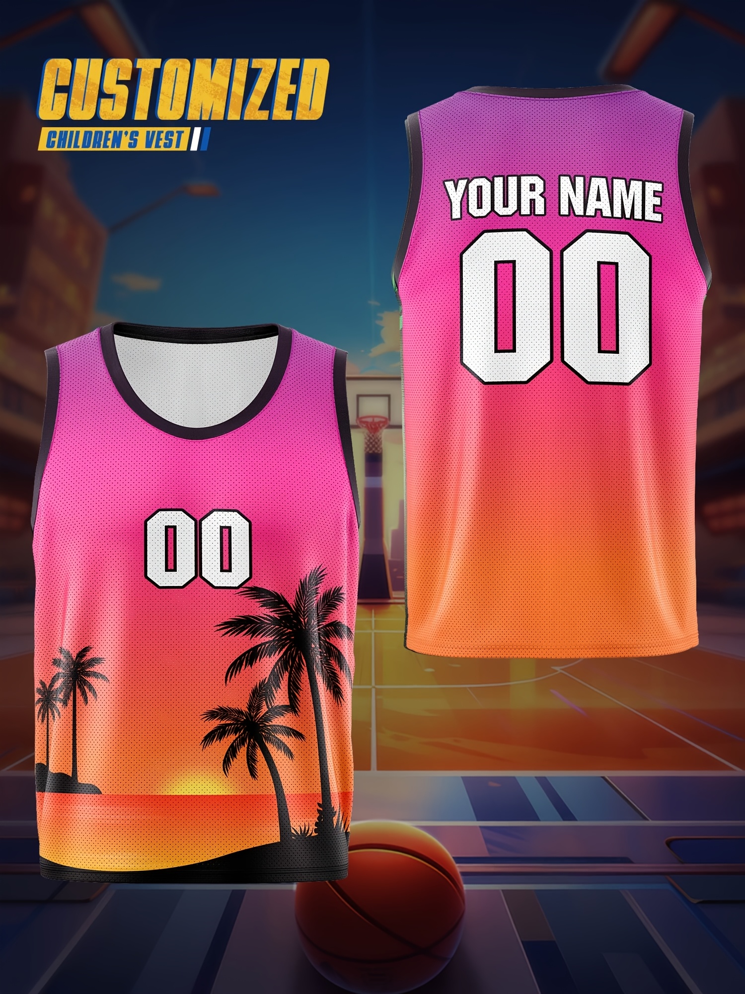 Custom Youngsters' Basketball Tank Top - Personalized Name & Number, Pink to Orange Gradient with Palm Tree Design, Breathable Polyester for Sports, Training, and Outdoor Play