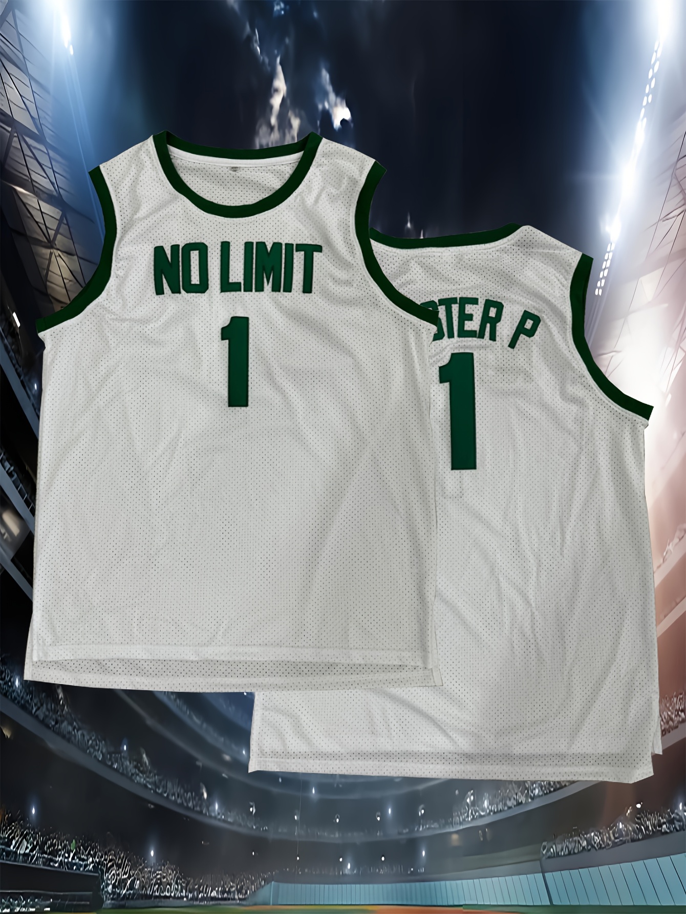 Men's #1 Basketball Jersey - White with Green "NO LIMIT" Embroidery, Loose Fit, Round Neck, Breathable Polyester Knit for Sports & Casual Wear, Sizes S-XXXL